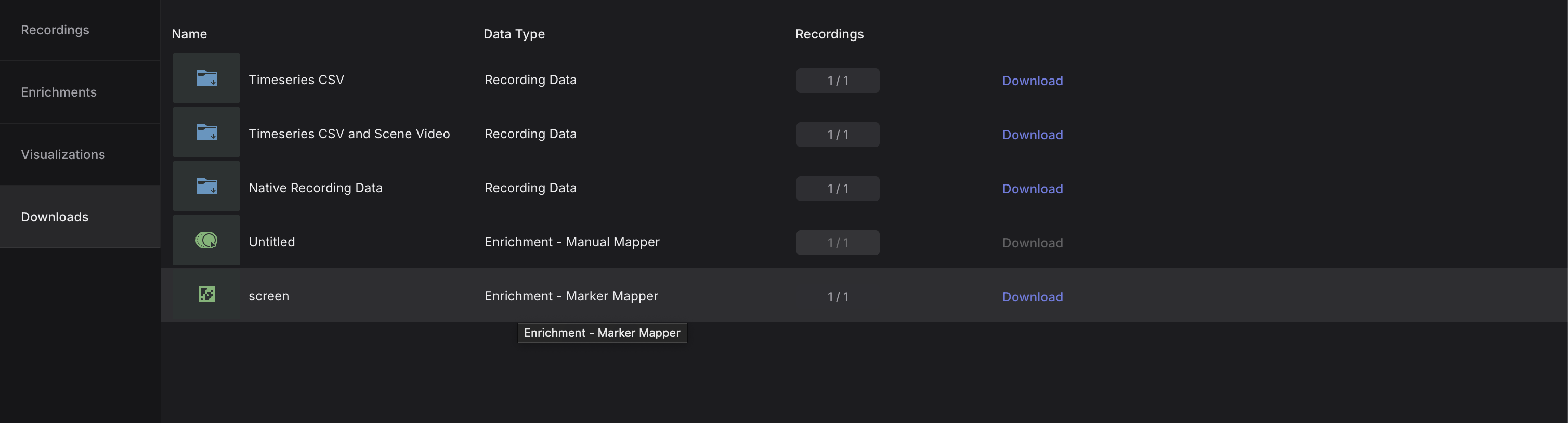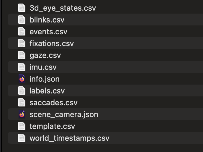Once you collect data with Pupil Labs Neon, your recordings live in Pupil Cloud. Export the Time Series for each recording (CSV export). After the export finishes, you’ll have a folder per participant/recording containing multiple CSV files.